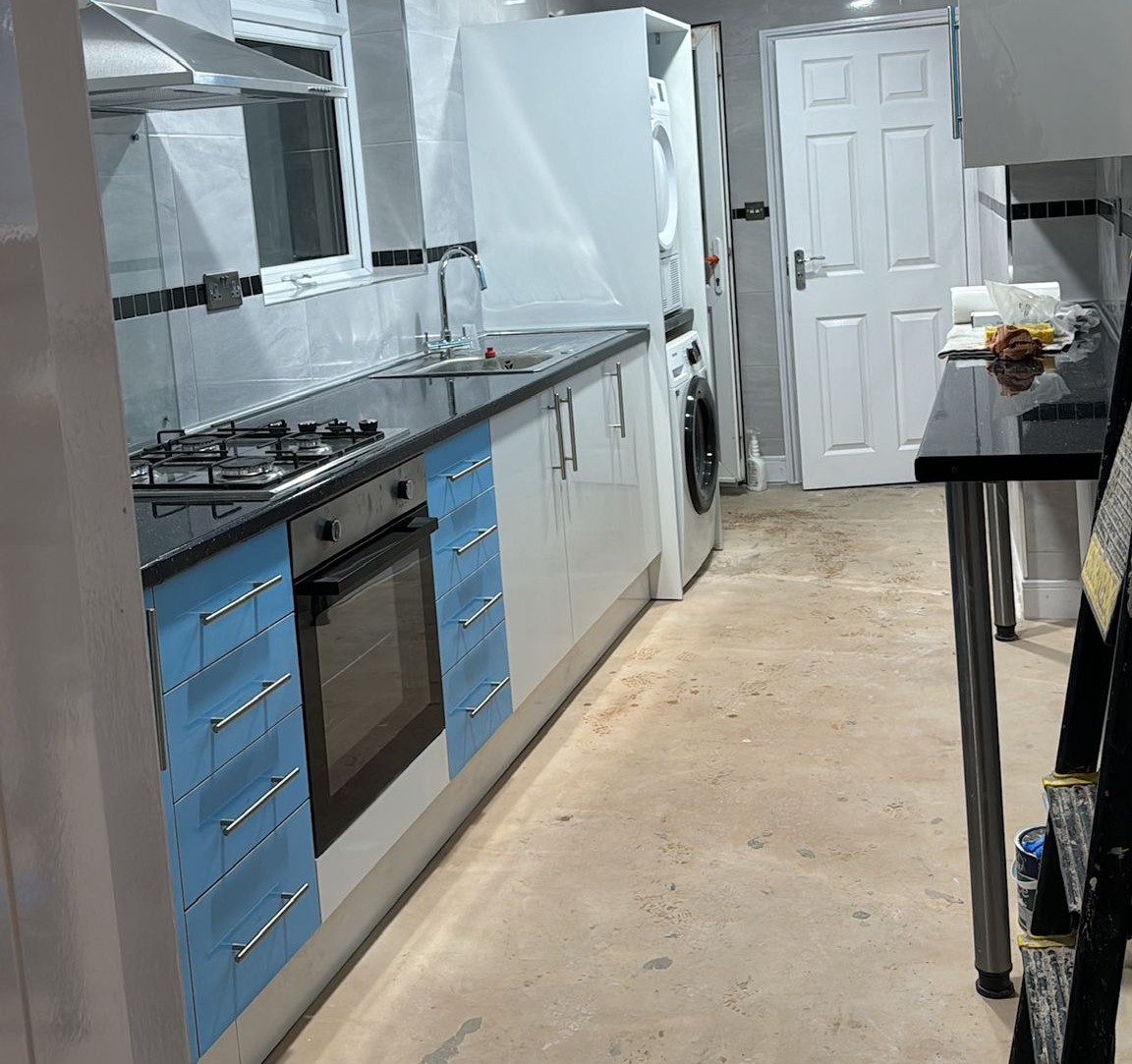 Tiling is the process of fixing tiles on floors, walls, or other surfaces to create a smooth, strong, and decorative finish. It is commonly used in kitchens.
